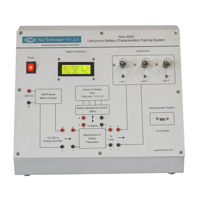 Energy storage is becoming increasingly important for improving the efficiency, reliability and price-competitiveness of power utilities and Electric Vehicles, and to achieve deeper integration with intermittent renewable energies. Battery is an energy storage device consisting of two or more electrochemical cells that convert stored chemical energy into electrical energy and used as a source of power. As an energy storage device, the use of the battery is increasing day by day such as in automobiles, inverter , UPS, off- grid renewable energy sources. Nvis 425 and Nvis 425A Battery Characteristics Training Systems introduce students to the operation of Lead-Acid and Li-ion batteries. Hands-on experiments cover the charging and discharging characteristics of lead-acid and Li-ion batteries.