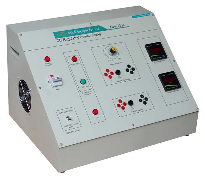 Nvis 725A DC Supply is used in electrical engineering laboratories for the purpose of conducting experiments in DC Machines and Circuits. This product provides 200V Fixed and Variable DC output for continuous operation with an over current protection. Output voltage and current can being continuously monitored by front panel meters. The main power assembly consists of a thyristor bridge circuit which rectifies the incoming AC supply to produce a Fixed DC supply. Rectified voltage can be varied by altering the firing angle of the thyristors thereby providing Variable DC Output to the DC Machines.