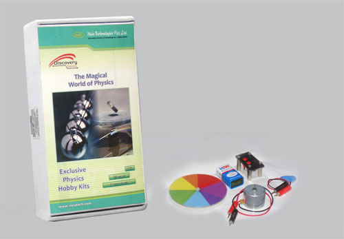 A Newton disc is a disc with segments in rainbow colors in a definite proportion. When the disc is rotated, the colors fade to white; in this way Isaac Newton demonstrated that white light is a combination of the seven different colors found in a rainbow. We provide DC motor and its driving battery to rotate the Newton’s disc