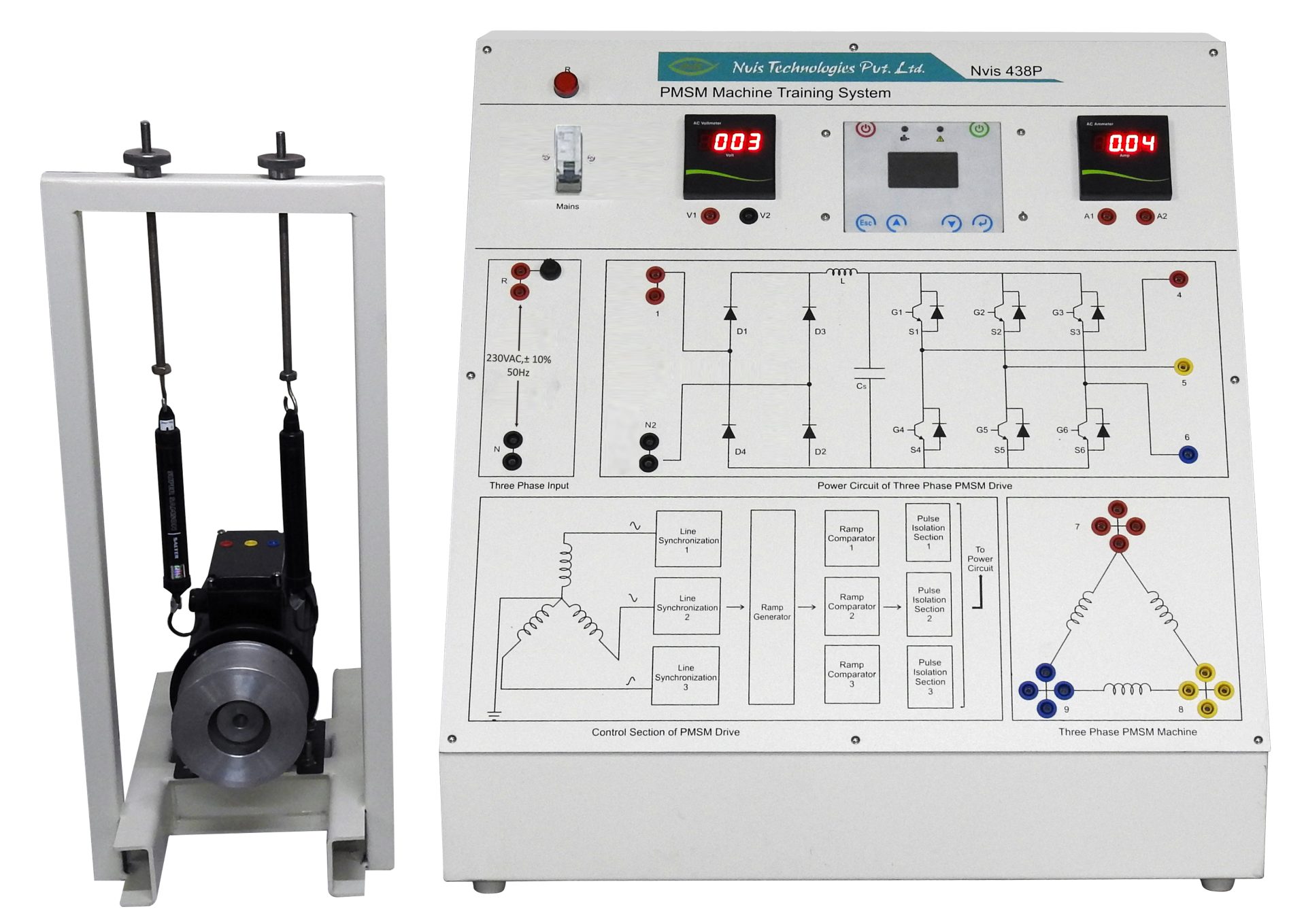 Nvis 438P provides a comprehensive learning experience for working of PMSM motor through experiments such as running and reversing, torque-speed characteristics, load characteristics, speed controlling using VVVF technique, etc.